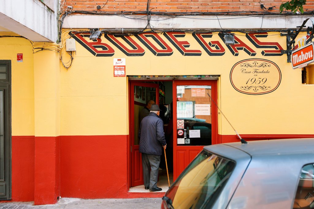 The façade carries the colours of the Spanish flag, though deeper, sunnier and warmer somehow. The italic typeface of the bodega is iconic. Inside, the classiness and warmth continues with no excess frills. The bar top is plain wooden Formica, the ceramic wine barrels are the same red as the façade.