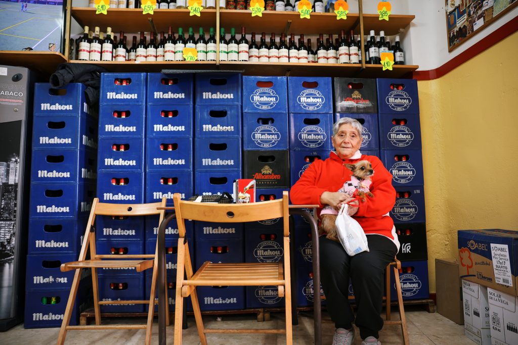 A woman asks her dog to smile for the camera. Instead, it gives me a look of concern. The wall behind her is stacked so densely with Mahou crates that it reads like a partition to another room – maybe it is but the crates have been there so long, no one really remembers.