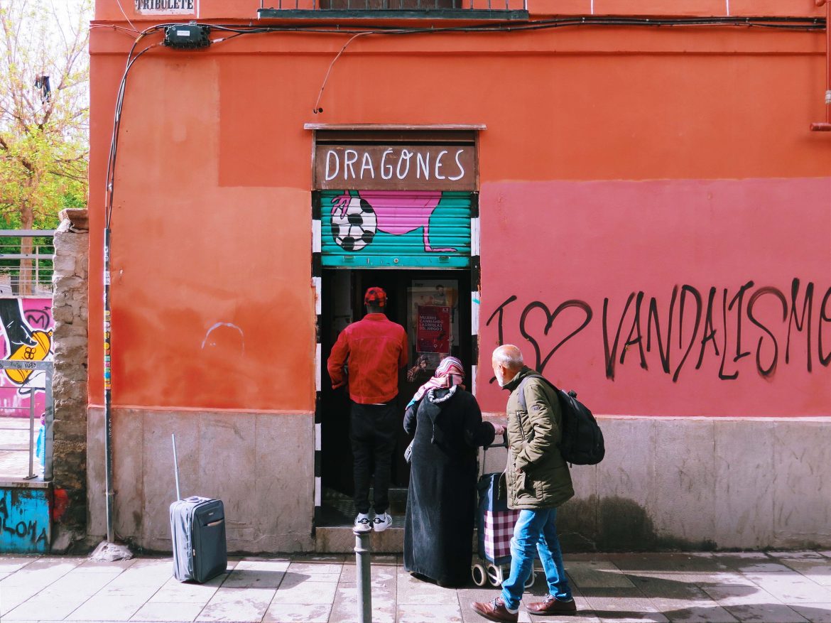 An elderly couple, each carrying a wheelie suitcase, knock at the door of Dragones de Lavapiés and ask for food. “What’s your address?” asks Sanaa in Arabic, a volunteer at the food bank. The couple dance around the question, and Sanaa asks “Are you sleeping on the street?”. The man replies, “Yes”.